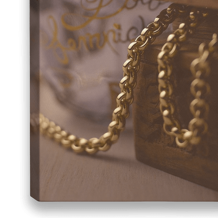 Een stilleven met een gouden ketting, een bewerkt sierradenkistje van hout en een flesje parfum in de achtergrond. Voor deze foto is zacht licht gecreëerd die de zachte, romantische en warme sfeer benadrukt.