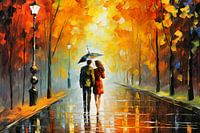 Romantisch digitaal schilderij van een stel dat langs een herfstige laan loopt.