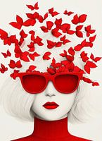 Dit kunstwerk, een portret van een vrouw met een dichte rode bril en witblond haar, is een meesterwerk van contrast en stijl. De witte en rode kleuren domineren het beeld, wat een sterke en opvallende uitstraling creëert.