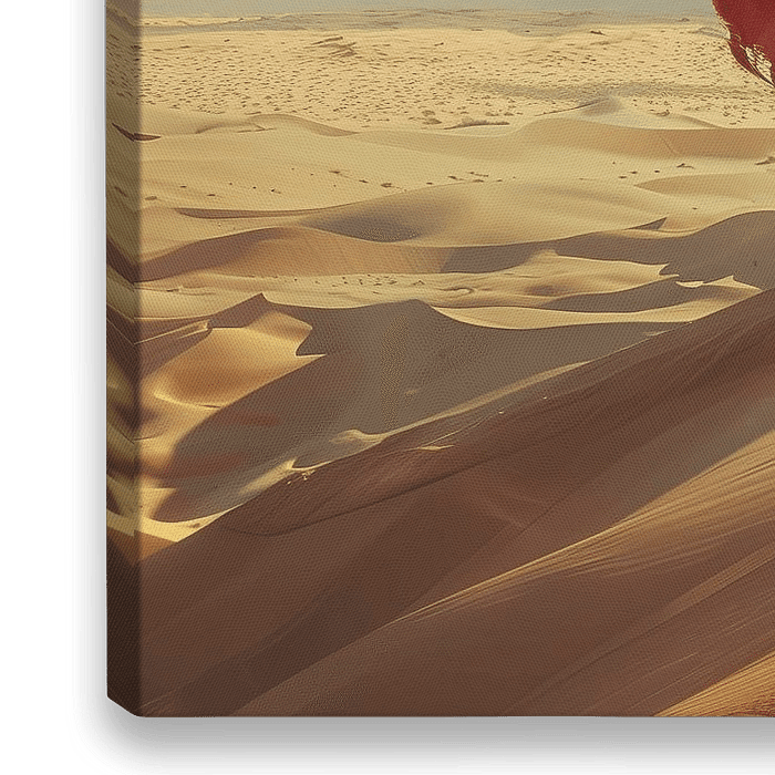Digitaal gemaakt werk van een bedoeïene in de woestijn gehuld in fel rode kledij. Heerlijk werk voor aan de muur, het brengt je naar een voor de meeste mensen onbegaanbare plek waar het TE warm is maar waar een de nomade of bedoeïene leveren in vrede.