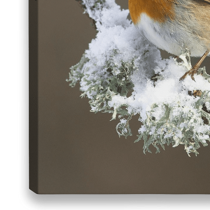 Roodborst in the sneeuw, zittend op een bemoste tak, tegen bruine achtergrond.