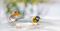 Roodborstje kijkt toe hoe koolmeesje eet.