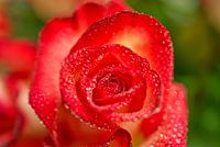Red Blush Rose Macro III - Een close-up van de delicate details van een rood-witte roos met waterdruppels op de bloemblaadjes. De druppels glinsteren als kleine juwelen en accentueren de fluweelachtige textuur en levendige kleur van de bloem.
