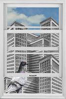 Hang dit kunstwerk aan uw muur en u heeft een instant uitzicht over de stad. De duif op uw raamkozijn krijgt u er gratis bij.