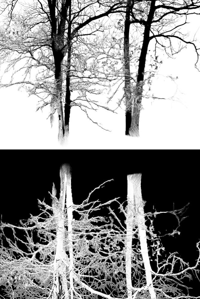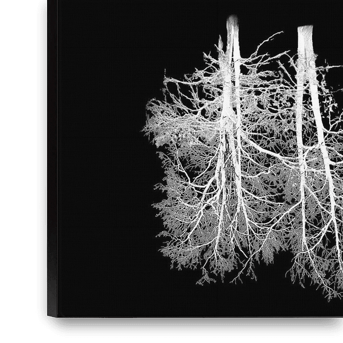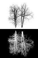 Deze intrigerende compositie legt de diepe verbondenheid tussen mens en natuur op een krachtige, minimalistische manier vast. Bovenin tonen twee kale bomen hun verfijnde netwerk van takken tegen een lichte achtergrond. Daaronder verschijnt een spiegelend beeld dat doet denken aan menselijke longen, waarbij de vertakkingen van de…