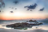 Avondopname vanaf een strand in Bretagne (Frankrijk), net na zonsondergang. De lucht kleurt mooi en de wolken geven een mooi contrast. Vooraan, en wat meer naar achter, zijn rotspartijen zichtbaar die voor de nodige dieptewerking zorgen.