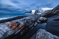 De kust van het eiland Senja bij Tungeneset wordt gevormd door grote rotsblokken. Bij zwaar weer kletteren de golven hard tegen de rotsformaties.