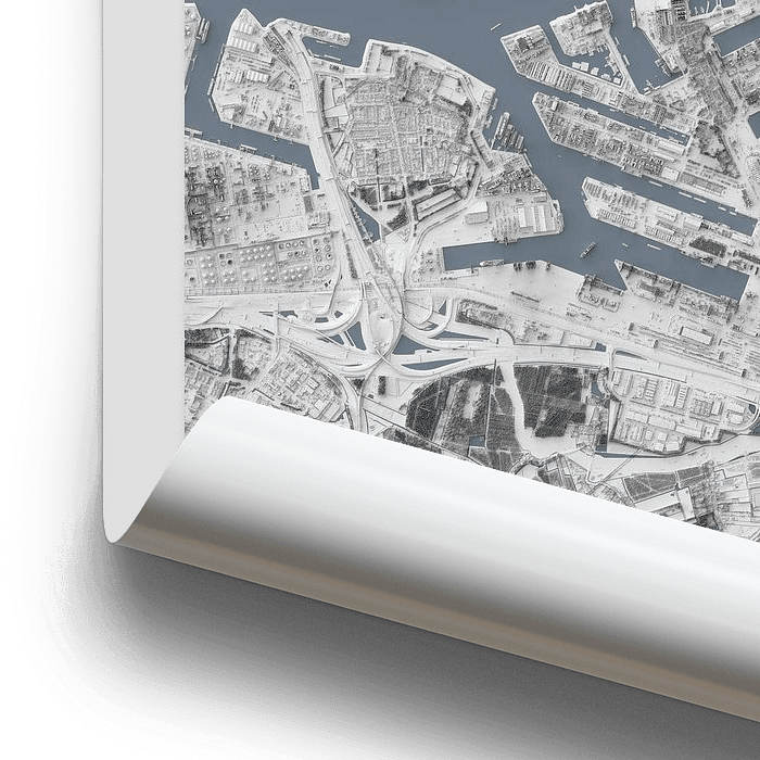 Een 3D reliëf plattegrond van het havengebied rondom de Nieuwe Waterweg tussen Rotterdam en Schiedam. Je kan de bootjes zien liggen.