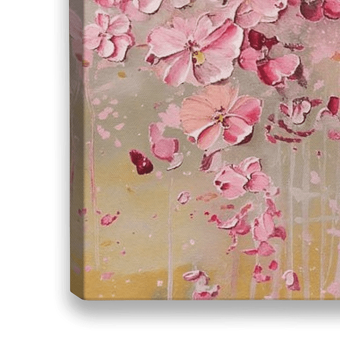 Dit werk straalt een romantische en dromerige sfeer uit. De delicate bloemblaadjes lijken te zweven in de lucht, met zachte kleuren die variëren van diep roze tot pastel tinten. Dit werk roept gevoelens van vreugde en lente op, en zou een perfecte aanvulling zijn voor een interieur dat warmte en elegantie uitstraalt. Het brengt een…