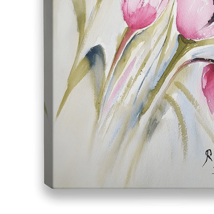 Deze aquarel toont een dromerige compositie van roze tulpen, geschilderd met een losse, expressieve toets die de fragiele schoonheid van de bloemen accentueert. De kunstenaar heeft gekozen voor zachte, vervloeiende lijnen en een subtiel kleurenpalet, waarin tinten van roze, groen en blauw harmonieus samenvloeien.