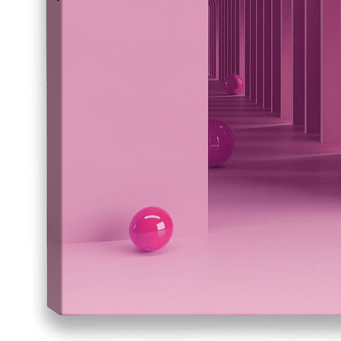 Driedimensionaal (3D) abstract design, doorkijk/galerij van roze bogen met marmeren bollen. Kleurrijk, afwisselende lichtinval met slagschaduw.