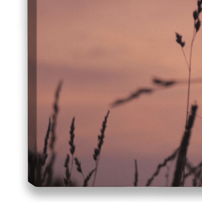 Foto van rietstengels tijdens de zonsondergang. De lucht kleurt roze, oranje en paars. Sommige rietstengels zijn onscherp, wat de foto diepte geeft. Mooie warme foto voor aan de muur.