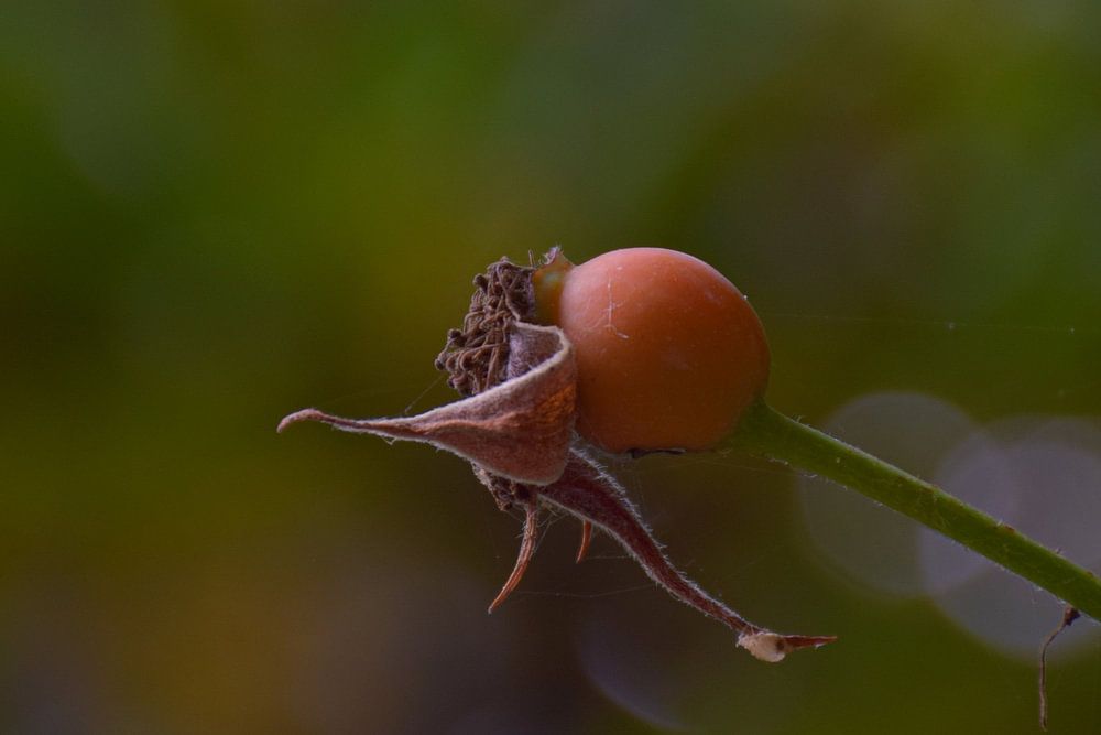 In onze tuin staat een geweldige donkerroze roos, Rosarium Uetersen. Als je de uitgebloeide rozen niet afsnoeid verschijnen er rozenbottels, maar meestal vallen ze er hier alsnog af. Soms blijft er wel een zitten ( van de tientallen bloemen die deze roos per jaar voortbrengt), zoals deze dit jaar. Zo prachtig in het vroege licht van 20 oktober 2024, met op de achtergrond de zachte herfsttinten.