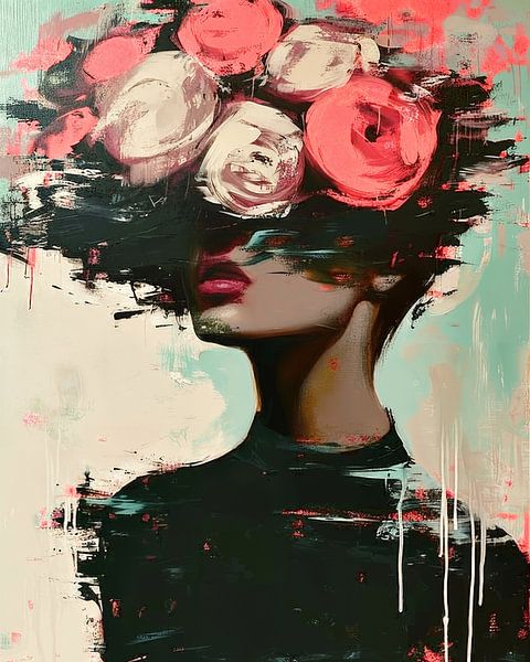 De prominente kenmerken zijn bedekt met ruwe, expressieve penseelstreken die bloemen of rozen lijken voor te stellen, resulterend in een bijna droomachtige hoed die de…