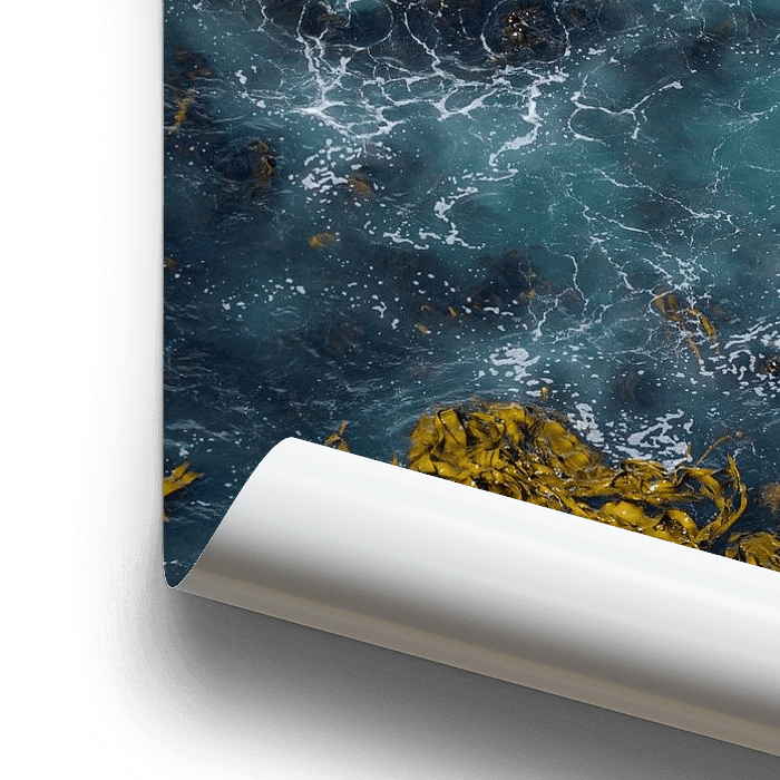 Ruige zee bij een klif op het Zuidereiland. Vanaf grote hoogte kijk je naar beneden in de oceaan. Het intense kleuren geven een bijna abstract beeld. Branding en zeewier en een turquoise zee.