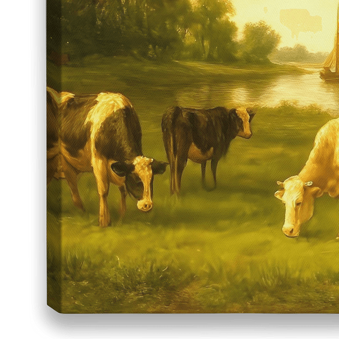 Dit schilderij ademt de sfeer van het Hollandse landschap uit de Gouden Eeuw, gevangen in een warme, gouden gloed. Op de voorgrond grazen koeien rustig in het weelderige gras, hun vachten glanzend in het zachte zonlicht.