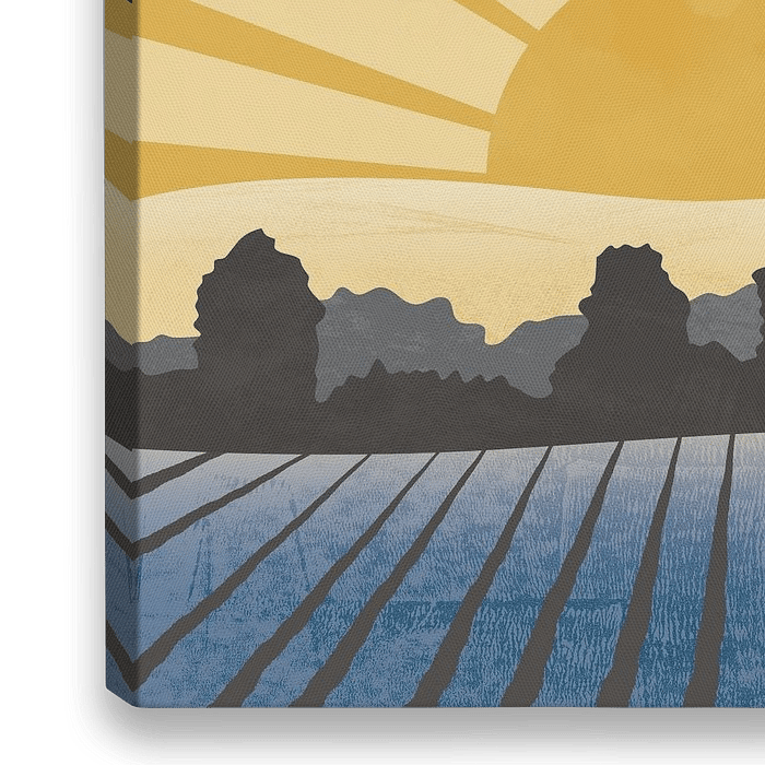 Minimalistisch landschap met velden op de voorgrond, die zich uitstrekken tot een bos. Achter het bos zijn er meer velden te zien en op de achtergrond de opkomende zon met iconische zonnestralen. De kleuren geel en oranje staan voor de warmte van de zon, terwijl de kleuren blauw en grijs de koele lucht en de schaduwen van de nacht…