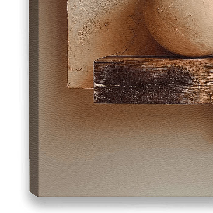 Moderne wandkunst met abstracte elementen, met rustieke houten en keramische stukken gerangschikt in een asymmetrische compositie. Het gebruik van aardse tinten geeft diepte aan de textuur van het kunstwerk.