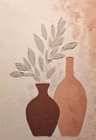 De rechtervaas, in een zachte terracottatint, voegt een aards element toe aan de compositie. Het kleurenpalet is ingetogen en roept een rustieke sfeer op. De textuur in de achtergrond suggereert de imperfecties van een muur die de tijd heeft doorstaan, wat bijdraagt aan het nostalgische gevoel van het werk.