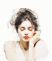 vrouwelijk figuur in een staat van rust of reflectie. Haar blik is naar beneden gericht, wat een gevoel van introspectie of dagdromen suggereert. De stijl van het werk is modern en lijkt een digitale penseelstreektechniek te gebruiken, wat resulteert in een combinatie van scherpe lijnen en zachte kleurovergangen. De kleurstelling is…
