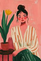Een stijlvol digitaal portret in warme rozetinten toont een contemplatief moment van rust. De figuur, gekleed in een gestreepte crèmekleurige blouse en donkergroene broek, wordt vergezeld door een gele tulp in een terracotta pot. De minimalistische compositie en zachte penseelstreken creëren een harmonieus samenspel van kleur en vorm,…