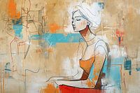 Rustige Reflectie - Dit schilderij toont een modern portret van een vrouw in gedempte aardetinten met tactiele texturen en subtiele abstracte elementen. De lijnen zijn speels en toch verfijnd, met accenten in oranje en turquoise die een zachte dynamiek aan het stuk toevoegen. Het gebruik van ruwe penseelstreken en schraaptechnieken…