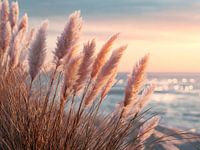 Een vleugje zomer danst door de zijdeachtige pluimen van het pampagras die wiegen in de zachte avondbries. Op de achtergrond fonkelt het water als vloeibaar licht, bespikkeld met parels van zonsondergang. Deze foto is pure harmonie; een tedere omhelzing van natuur, licht en elegantie. Het straalt rust, warmte en een vleugje verlangen…