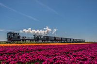 Stoomtram LTM-26 van de SHM passeert één van de vele tulpenvelden langs de museumspoorlijn Hoorn - Medemblik