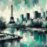 Romantische skyline van Parijs, geschilderd in abstracte en pastelkleuren. Langs de Seine en natuurlijk met de Eiffeltoren. Moderne gemengde techniek, digitaal gemaakt. ©12/2024 door Pia Schneider, atelier COLOUR-VISION
