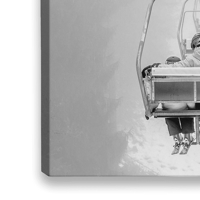 De eerste rit omhoog van de dag. Vader en zoon in de skilift naar de top om dan samen naar beneden te skiën. Het is nog vroeg en er hangt nog mist tussen de bomen wat een serene sfeer geeft