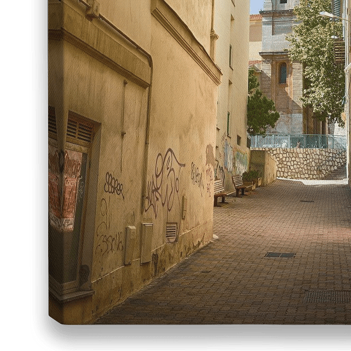 Kleurrijk High Dynamic Range (HDR) straatbeeld van een smal steegje met zicht op een kerktoren in het Italiaanse San Remo, gelegen aan de bloemriviera.