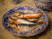 Koop dit stilleven Sardines op Delftsblauw servies – klassiek stilleven met warme penseelstreken van But First Framing op canvas, aluminium dibond, (ingelijste) fotoprint, behang en ArtFrame, op maat geprint in Fine-Art kwaliteit.