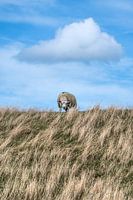 Een schaap op de dijk in het noorden van Friesland nabij Vijfhuizen met een wolk op de achtergrond.