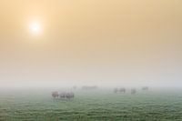 Prachtige opname van een kudde schapen in de mist op een vroege ochtend in een groen weiland in Nederland met een waterig zonnetje in de lucht