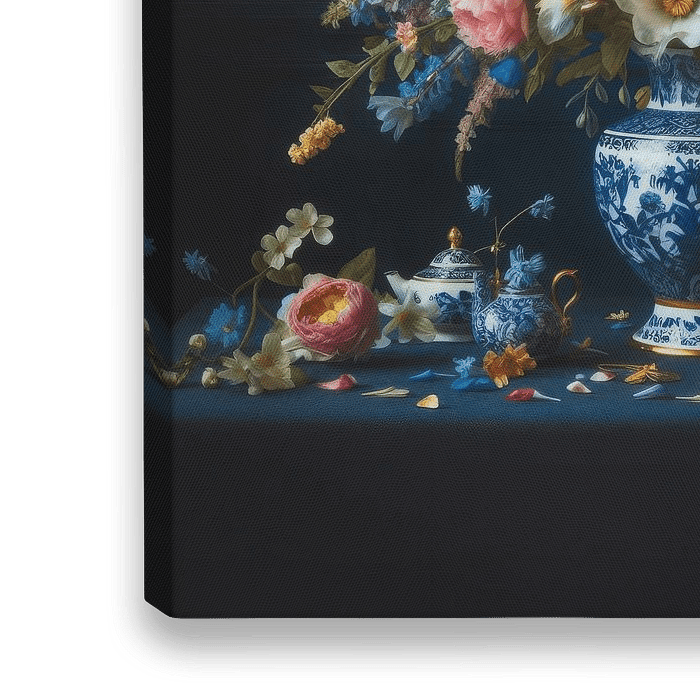 Over ‘Schilderij van Delfts blauwe vaas met boeket verse bloemen en droogbloemen’ van Dutch Art Works