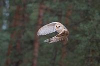 Barn Owl / Schleiereule ( Tyto alba ) in energetic flight, at the edge of a forest, frontal view, detailed shot.