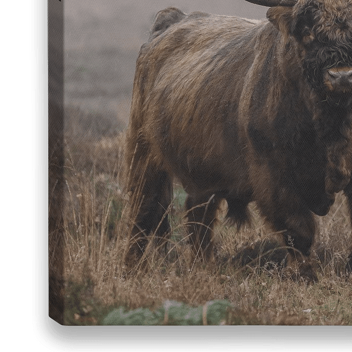 Een schotse Hooglander stier die staat op de Veluwezoom in de motregen die zachtjes op zijn harige vacht valt. Stoer in het landschap staat deze grote jongen.