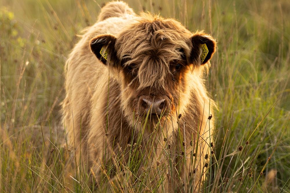 Nieuwsgierig komt deze jonge Schotse hooglander naar me toe gewandeld tussen het hoge gras.