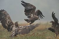 White-tailed Eagles / Sea Eagles / Seeadler ( Haliaeetus albicilla ), immature, subadults, in fight, fighting, hazy morning, wetland, wildlife, Europe.