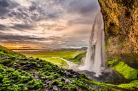 Seljalandsfoss waterval in IJsland met zonsondergang op de achtergrond.
