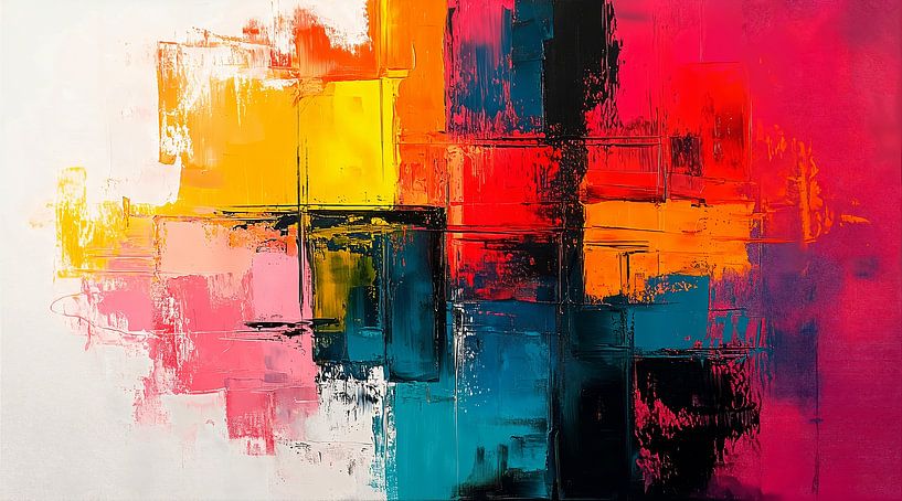 Een abstract kunstwerk met levendige kleurblokken in een moderne kunststijl met sterke penseelstreken. De compositie brengt een algeheel gevoel van energie en beweging over.