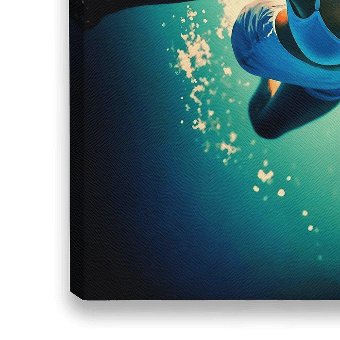 Ik probeerde de delicate balans tussen rust en beweging in de onderwaterwereld vast te leggen. Dit schilderij, "Submerged Serenity", is een viering van de menselijke band met water - een rijk dat zowel kalmerend als dynamisch is.