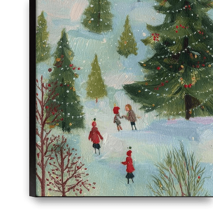 In dit kunstwerk zien we een charmant winterdorp waar overal kleine figuren door de sneeuw wandelen. De lucht is gevuld met zachte sneeuwvlokken die langzaam naar beneden dwarrelen. In het midden staat een grote kerstboom die prachtig is versierd met rode en gouden accenten. De huisjes in warme roodtinten geven het geheel een knusse…