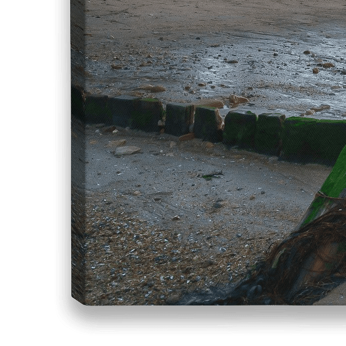 HDR foto van de Normandische kust op het strand van Saint-Aubin-sur-Mer, bij een sfeervolle en kleurrijke zonsondergang. De wolken geven hierbij extra dynamiek, terwijl de laatste zonnestralen op de statige gebouwen aan de boulevard schijnen.