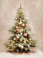 In dit werk zie je een kerstboom die straalt door zijn zachte en schilderachtige uitstraling. De takken zijn vol maar luchtig uitgewerkt waardoor de boom een natuurlijke en warme vorm houdt. Overal tussen het groen hangen sierlijke ornamenten in tinten als goud, roze en champagne die het geheel een elegante glans geven. Het licht…