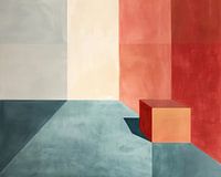 Shades of Solitude - Dit abstracte schilderij toont een compositie met geometrische vormen waarbij een grote rode rechthoek domineert, naast een subtiel geplaatste, kleinere kubus in dezelfde tint met een krachtig contrast tegen een achtergrond van pastel beige en diepblauwe elementen.