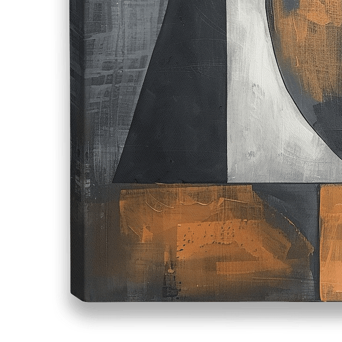Shadows and Sunspot - Dit abstracte schilderij kenmerkt zich door een dramatische interactie tussen geometrische vormen, met een prominente grijze cirkel en dynamische oranje en zwarte elementen tegen een getextureerde grijze achtergrond.