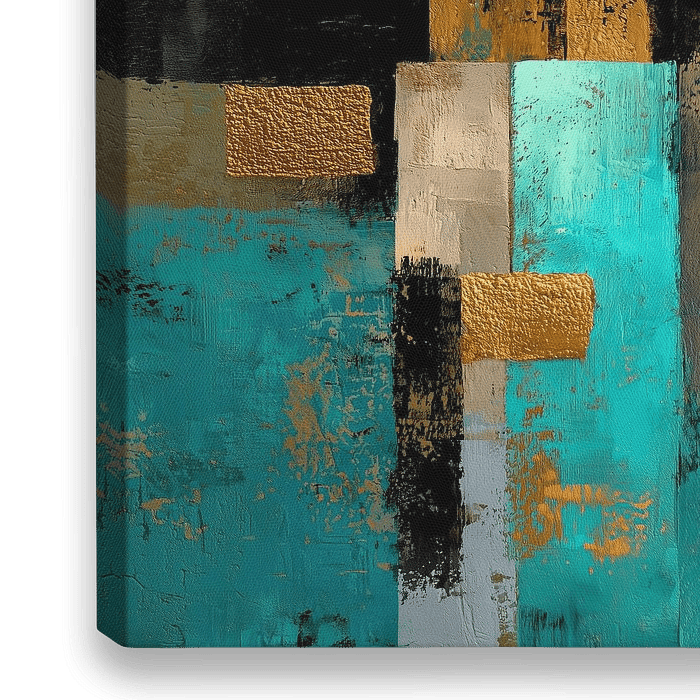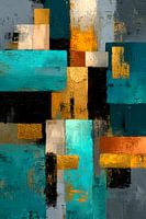Een abstract schilderij met een gestructureerde, impasto-techniek, bestaande uit een levendig mozaïek van rechthoekige kleurvlakken. De vlakken zijn in een verspringend, overlappend patroon gerangschikt, wat een gevoel van diepte en een dynamische compositie creëert.