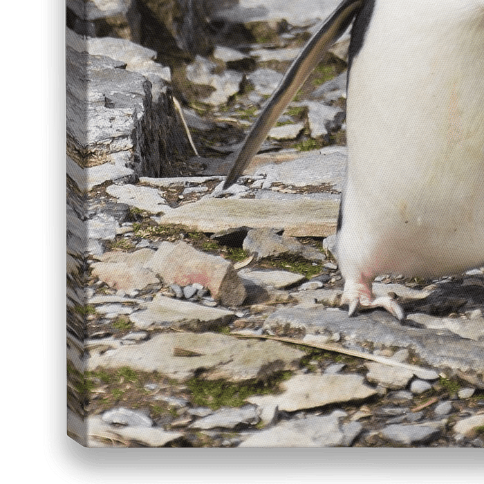 Deze vier Zuiderlijke Rotspinguins geven een voorstelling. Deze foto is genomen op de Falklandeilanden.