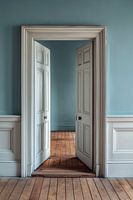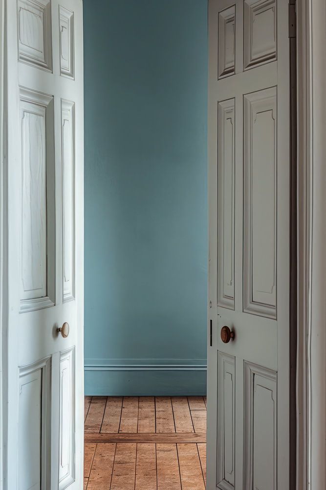 ‘Silent Passage — nr. 01’ is een verstilde interieurstudie waarin klassieke paneeldeuren, een houten vloer en zachtblauwe wanden samenkomen in een rustige, bijna filmische compositie. Dit beeld speelt met het idee van overgang: de momenten tussen vertrekken, binnenkomen, kiezen, pauzeren. Het is een beeld dat een zacht soort nieuwsgierigheid oproept — zonder iets letterlijk te vertellen. De ruimte oogt alsof er net iemand doorheen gelopen is, of alsof iemand zich op elk moment zou kunnen aandienen. Juist dat subtiele narratieve potentieel geeft het werk zijn spanning en elegantie.